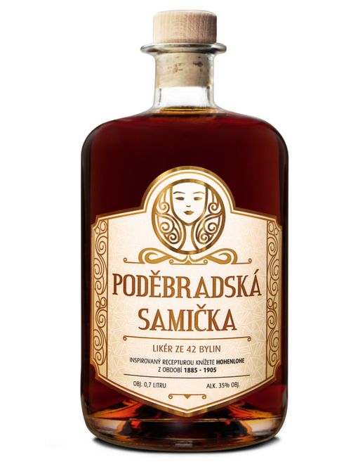 Poděbradská samička 35% Lahodný hořkosladký likér inspirován recepturou hraběte Hohenlohe. Delikátně vyvážená chuť jalovce, pelyňku, zeměžluče, kmínu a dalších 38 bylin. Příbeh samičky Koncem 19. století se kníže Filip Arnošt Hohenlohe z Schillingsfürstu přestěhoval na poděbradský zámek, který nechal opravit a spolu se svou ženou se tu rád zdržoval po celý rok. Z rodného Bavorska si kníže přivezl i recepturu jedinečného bylinného likéru obsahujícího jalovec, pelyněk, či zeměžluč. Na doporučení místního lékaře Dr. Boučka jej popíjel při každé snídaní na lačno. Na zámku se likéru říkalo Weibchen, což si český personál volně přeložil jako Samička. Nedlouho poté se vznikly v Poděbradech lázně a město se rychle proměnilo ve vyhledávané lázeňské středisko. K oblibě hojně navštěvovaného města přispěli ochotně i místní živnostníci, kteří se rychle přizpůsobili potřebám lázeňských hostů. Jedním z nich byl i pekař a kavárník Josef Váňa, který zde otevřel útulnou kavárnu, kam lákal hosty nejen na vyhlášenou kávu a pečivo, ale i na zdravotní likér v té době už široko daleko známý jako Samička, který začal připravovat podle osvědčeného receptu získaného od zámeckého personálu. Po znárodnění v roce 1948 se Váňově kavárně už nikdy nevrátila uvolněná atmosféra prvorepublikových poděbradských lázní a starých dobrých časů. Přesto se doposud zachovala vzpomínka v podobě původního receptu, který si kavárník Váňa ve svých začátcích opsal přímo od pamětníka knížete Hohenlohe ze zámku. Na originální recept se podařilo navázat v roce 2017. Lázeňští hosté si tak mohou Poděbradskou Samičku znovu dopřát po více než 100 letech od jejího vzniku!